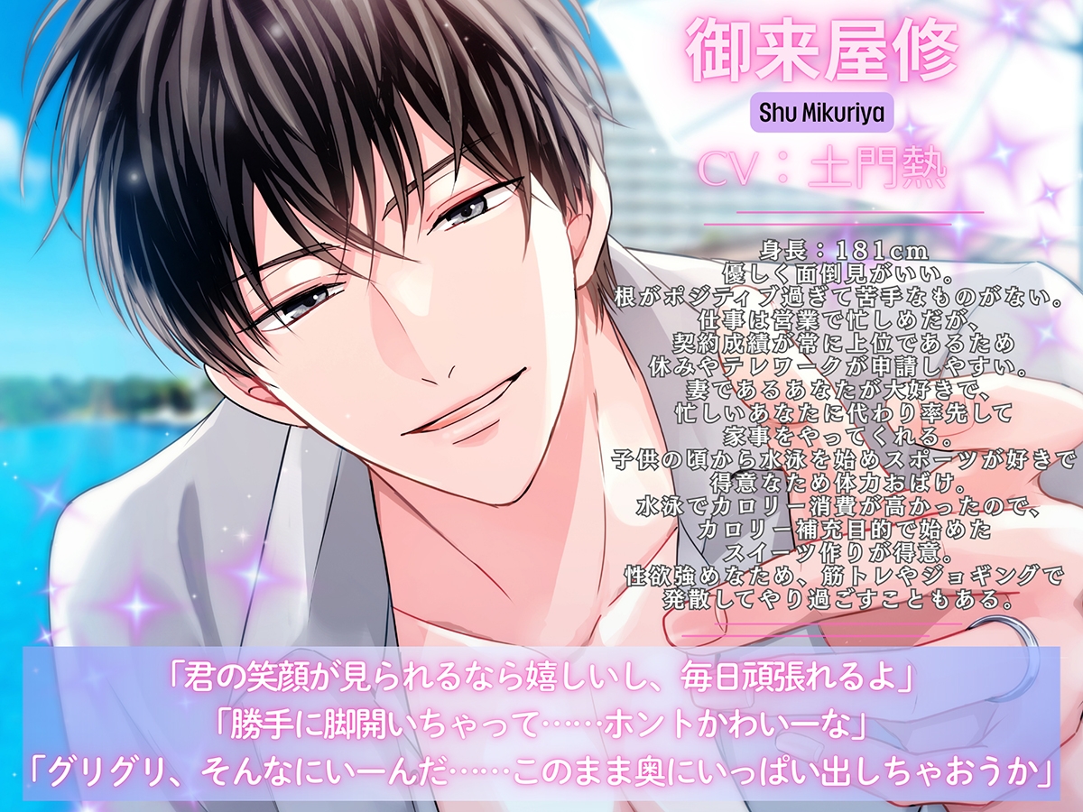 甘々な夫に癒されたい方におすすめ。土門熱さんの優しい声に包まれながら、愛されている実感を味わいたい人にはぴったりの作品です。