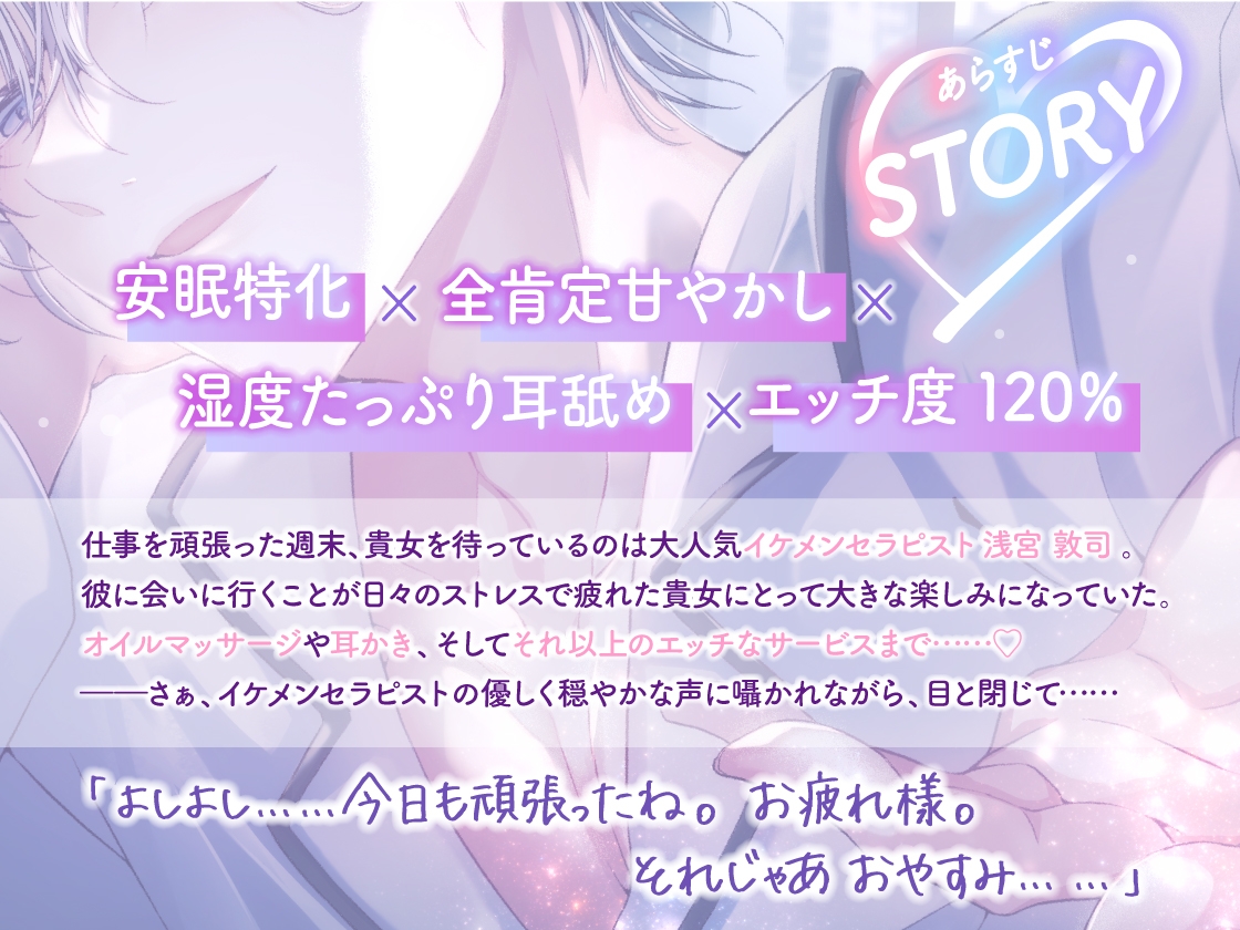 大人気イケメンセラピストに全肯定甘やかしされる至福の時間。KU100収録で耳元に彼がいるようなリアルな体験が楽しめます。