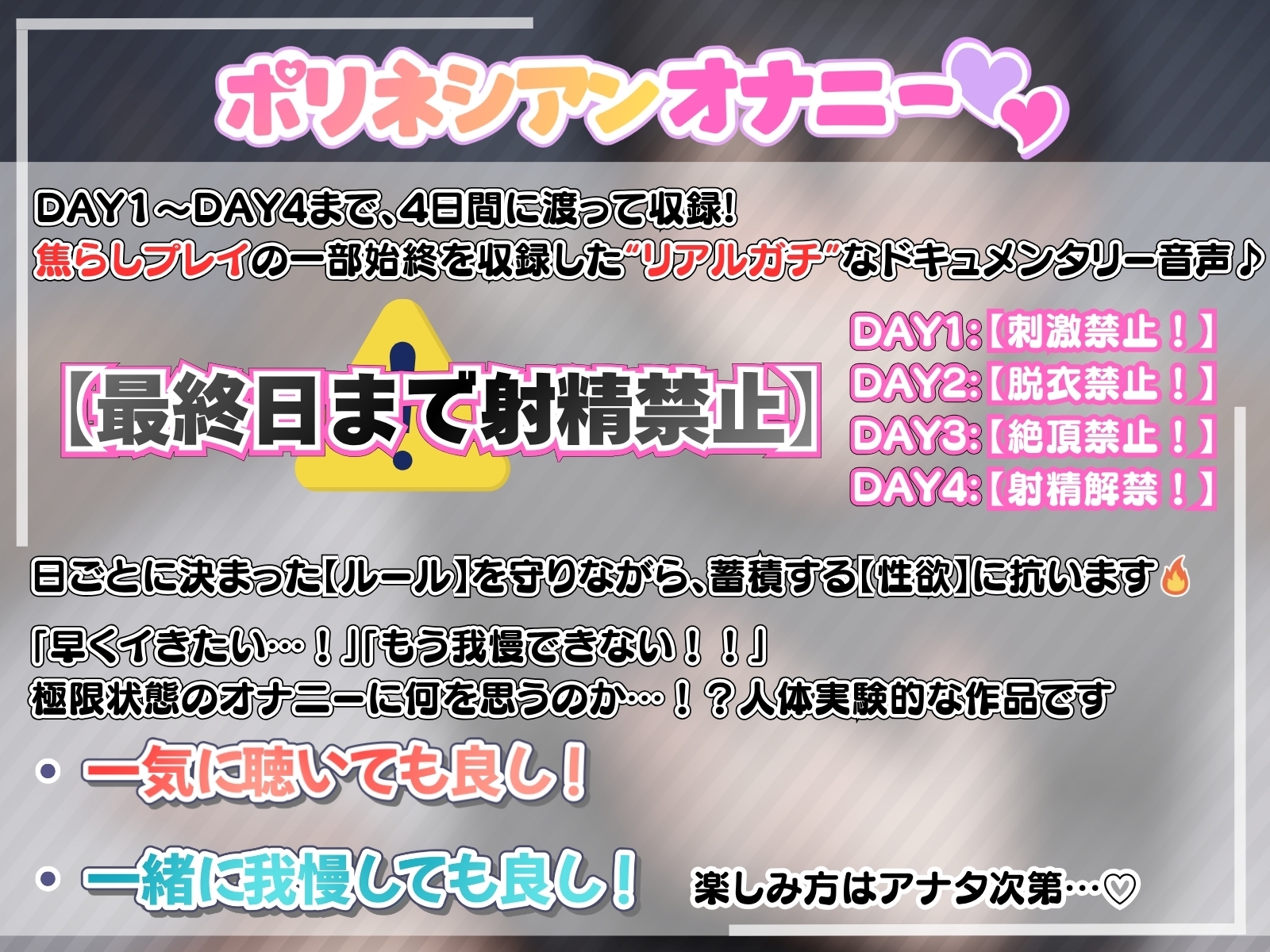 リアルな焦らしプレイを4日間にわたって収録したドキュメンタリー音声。低音ボイスでの淫語やオホ声がたまらない、刺激的な体験が待っています。